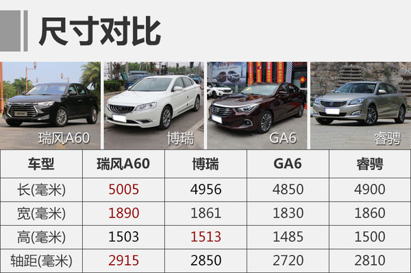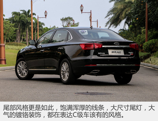 瑞风A60车身尺寸达到5005/1890/1503毫米,轴距2915毫米。轮圈采用17寸的多条辐样式,尾部拥有商务座驾的气质,宽厚饱满的尾灯,宽尺寸的镀铬装饰条都拥有一种稳重成熟之风。