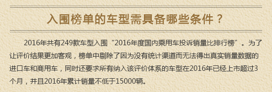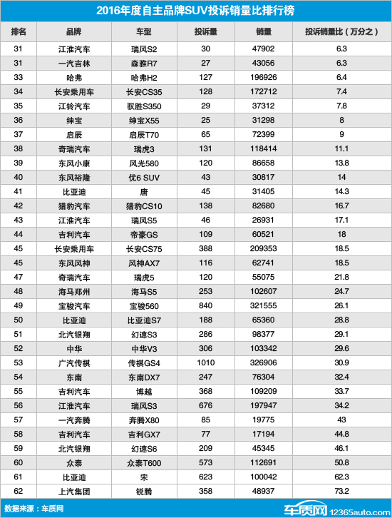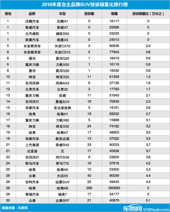 2016年度自主品牌SUV投诉销量比排行榜